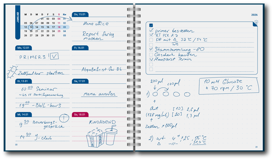 Unser Scientific Planner ist mehr als nur ein einfacher Kalender – er ist Dein persönlicher Organisationsassistent für das ganze Jahr! Mit dem Planner behältst Du nicht nur den Überblick über Deine Termine, sondern kannst auch Deine Projekte, Ziele und Aufgaben optimal planen und verwalten.