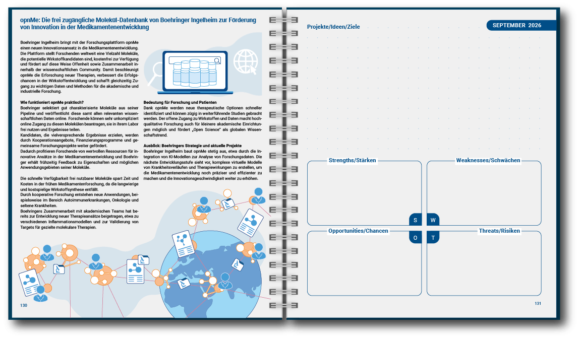 Monatliche Seiten zu Wissenschaftlichen Themen und verschiedenen Tools zur Organisation von Projekten