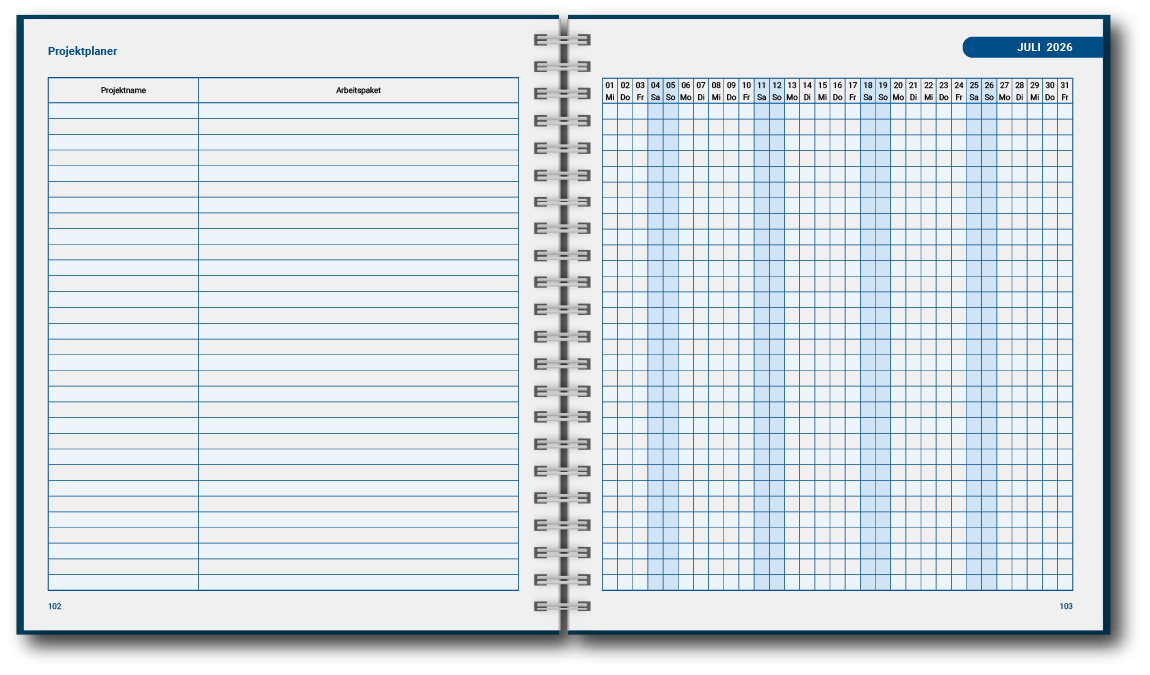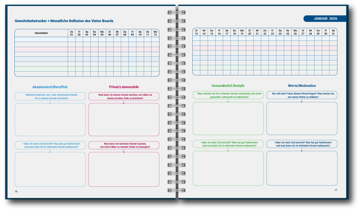Unser Multifunktionskalender ist perfekt für Profis, Studierende und alle, die ihre Zeit und Projekte effizient verwalten möchten. Mit hochwertigem Papier und einem stilvollen Design ist er nicht nur funktional, sondern auch ästhetisch und haptisch ein Genuss.